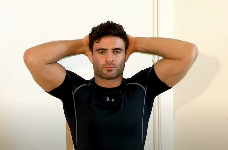 첫 번째는 목 좌우 늘리기. 등을 곧게 펴고 오른손으로 머리를 왼쪽으로 살짝 눌러, 왼쪽 목 옆이 당기는 느낌이 들 때 10초간 유지합니다. 반대 방향도 반복하세요.
