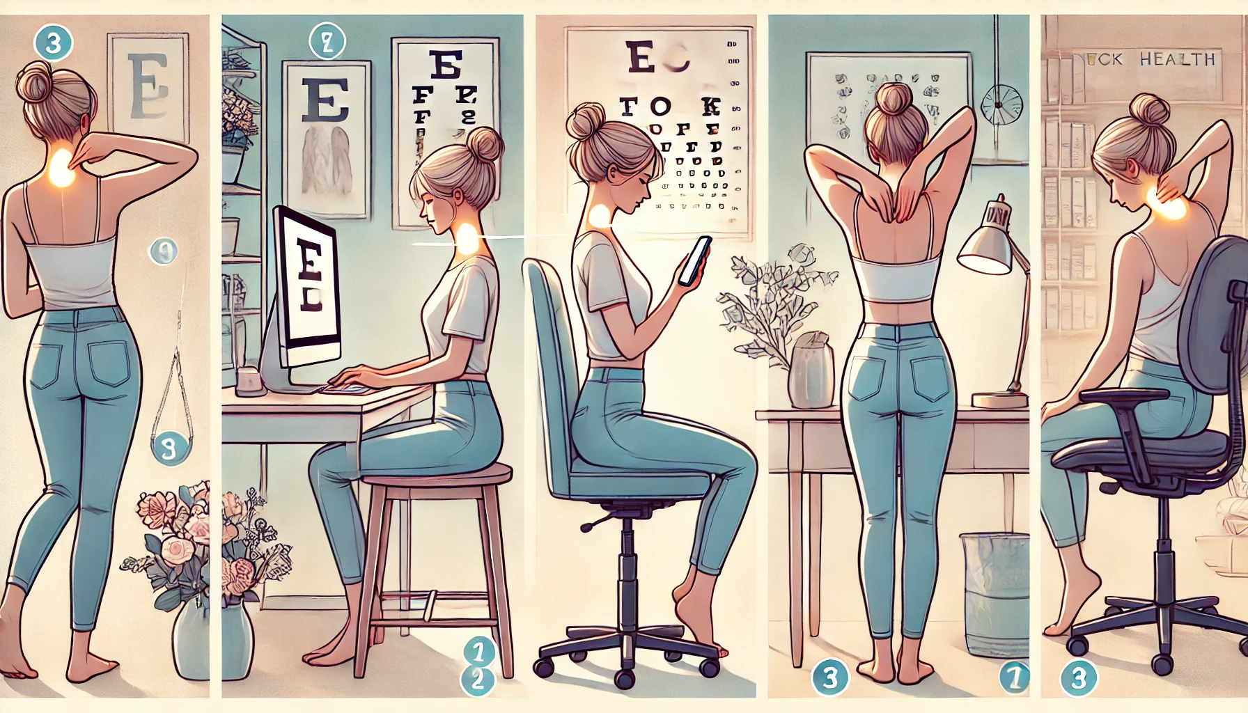 셋째, 앉을 때 엉덩이를 등받이에 밀착시키고, 어깨를 내리며 목을 길게 펴는 의식적인 자세 교정이 중요해요.