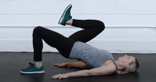두 번째는 브릿지 마칭. 브릿지를 유지한 상태에서 한쪽씩 무릎을 가슴 쪽으로 당기며 걷듯 움직여주세요. 중심을 유지하면서 코어와 엉덩이 양쪽을 교차 자극할 수 있어요.