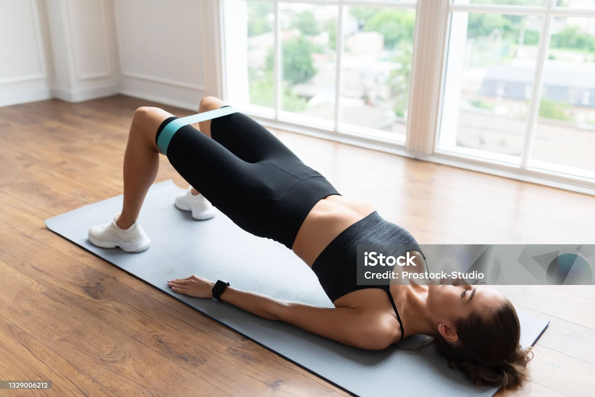 세 번째는 밴드 브릿지. 무릎에 힙 밴드를 감고 브릿지를 하면 둔근 외측과 중둔근 강화에 효과적입니다. 각각 10회씩 3세트로 구성하면 체형 교정과 하체 탄력 모두 챙길 수 있어요.