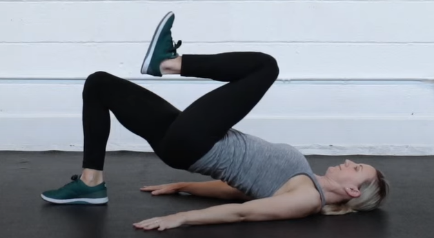 첫 번째는 싱글 레그 브릿지. 한쪽 다리를 들어 올린 채 브릿지를 실행하면 균형과 둔근 자극이 배가됩니다.