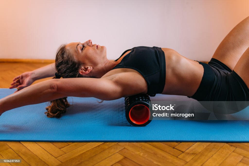 - 폼롤러 마사지: 등 상부를 중심으로 롤링해 긴장 해소