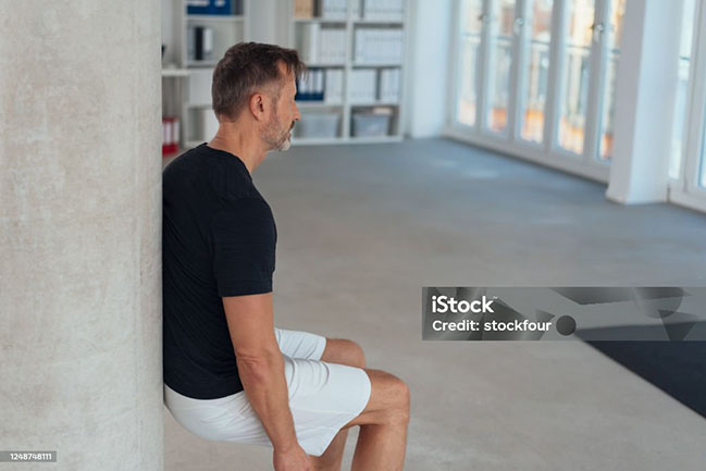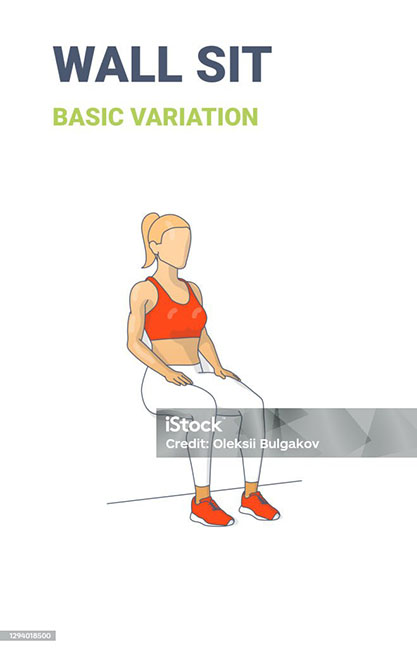 ✅벽에 기대 플랭크: 벽에 등을 대고 무릎 90도 굽혀 앉기 자세 유지 (30초)