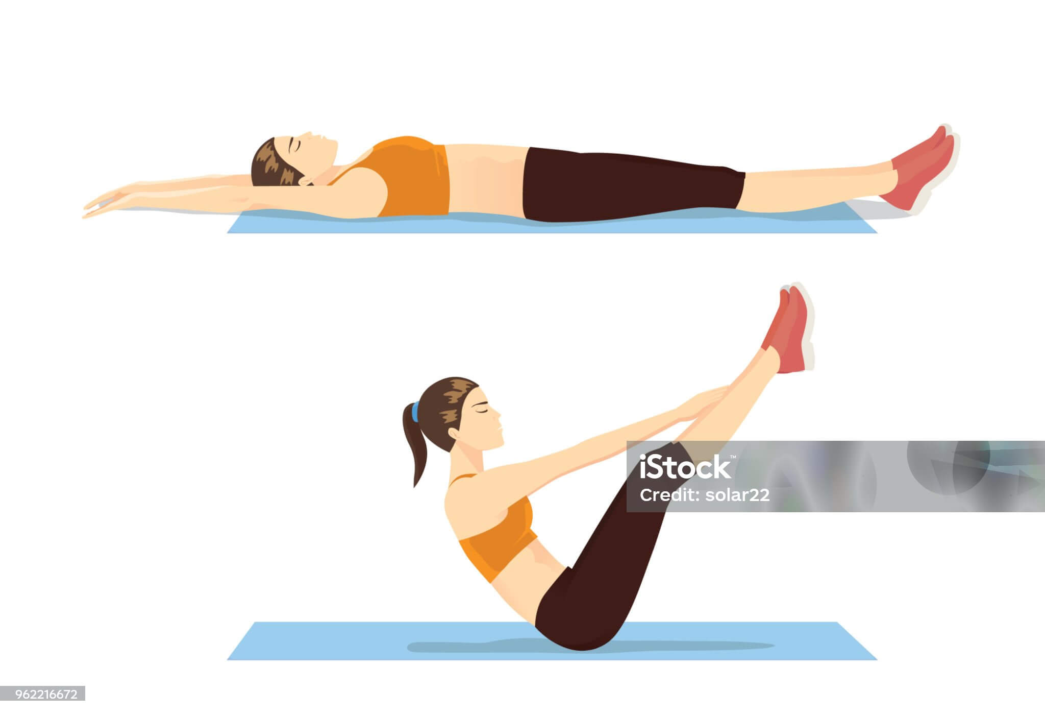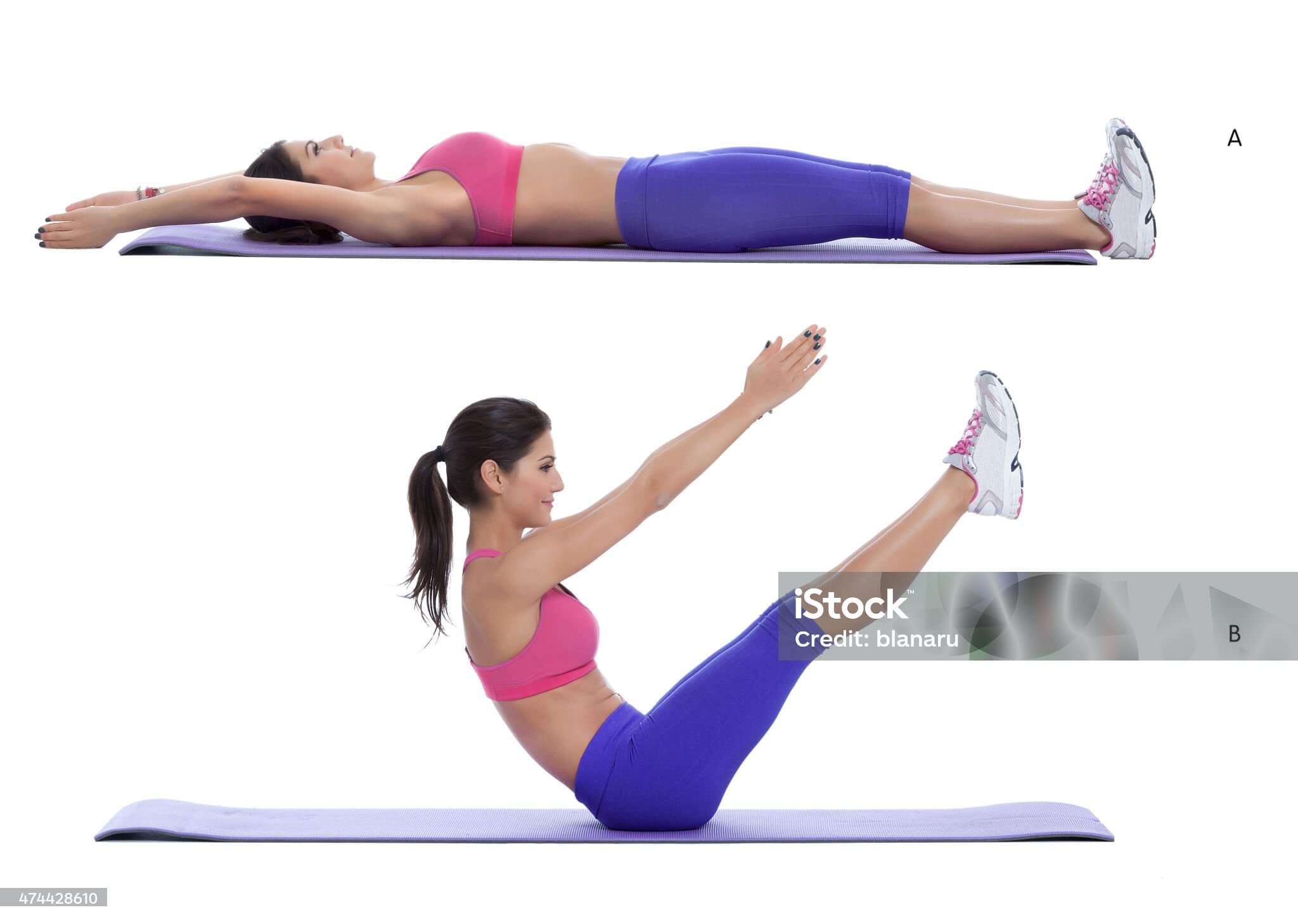 두 번째는 V업. 누운 상태에서 팔과 다리를 동시에 들어올려 몸을 'V'자로 만들고 3초 유지. 복직근과 하복부를 강력하게 자극해줘요.