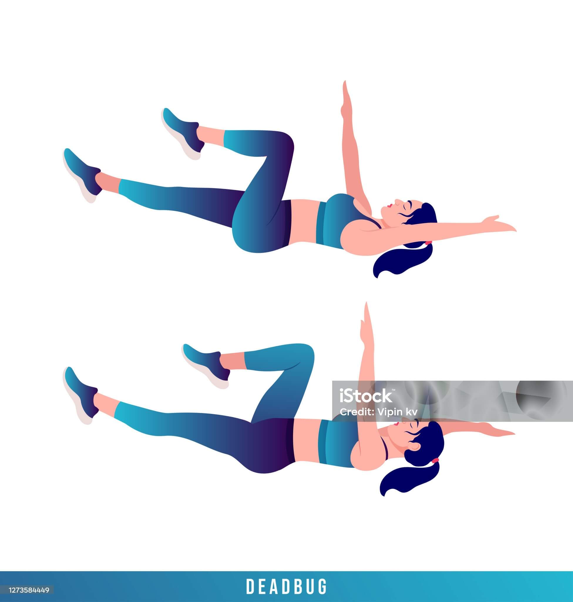 세 번째는 데드버그. 등을 대고 누운 상태에서 팔과 다리를 천천히 교차하며 내려갔다 올라오는 동작. 복부 중심 근육을 자극하며 안정성 강화에 탁월합니다.