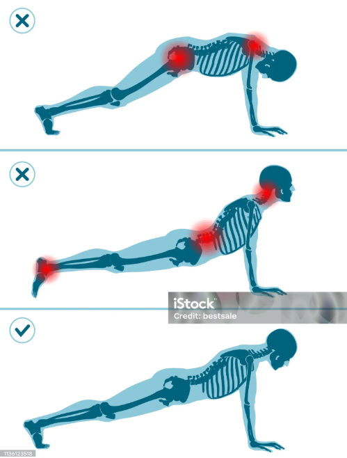 엉덩이가 너무 올라가거나 아래로 꺼지지 않도록 복부에 힘을 주고 골반을 살짝 말아준 상태를 유지해야 합니다.