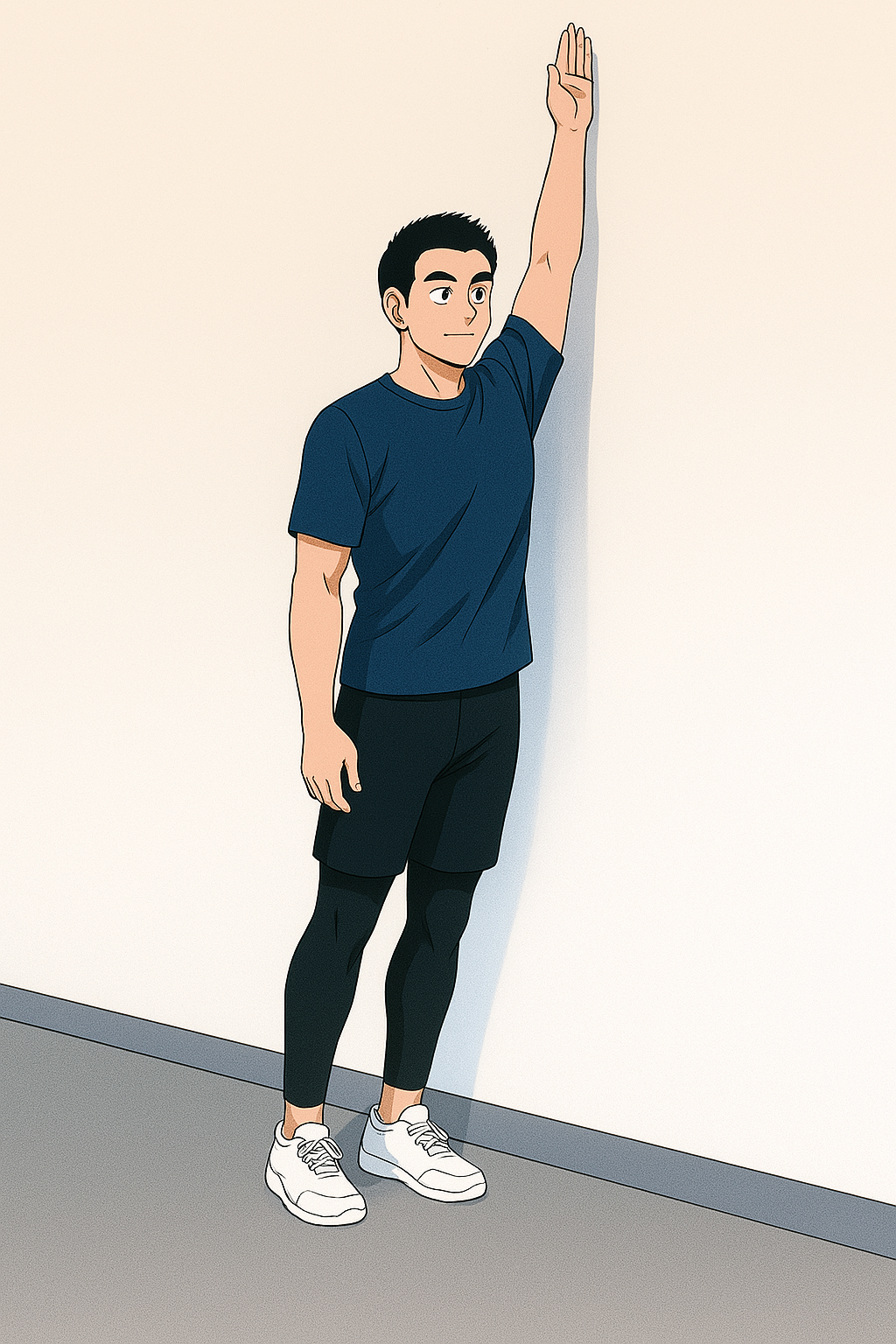 - 벽에 손 대고 팔 들어 올리기: 벽에 기대 팔을 쭉 위로 밀어 올리기