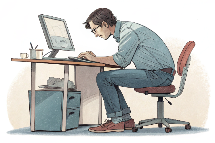 두 번째는 장시간 같은 자세를 유지하는 습관입니다. 오랫동안 앉아 있거나 서 있을 때도 근육이 경직되면서 허리에 무리가 가죠.