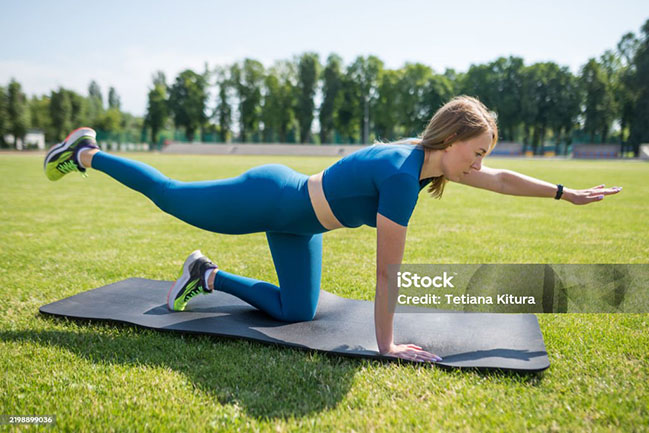 3️⃣버드독: 네발 기기 자세에서 팔과 다리를 교차로 들어올려 균형 잡기