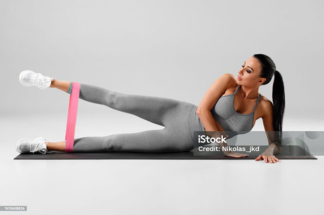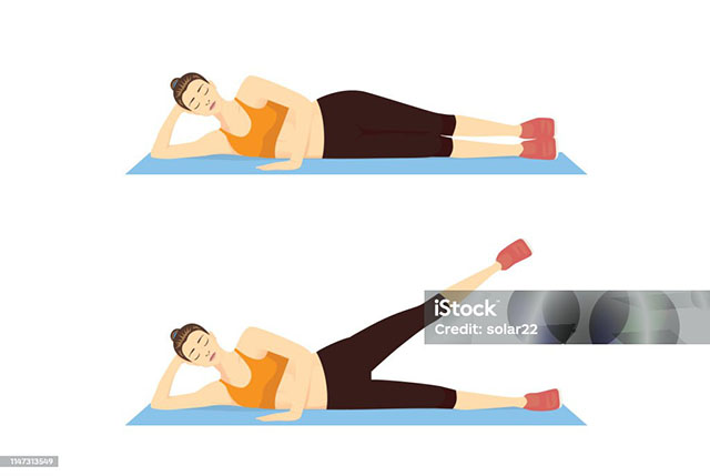 옆으로 누워서 한쪽 다리를 천천히 들어 올리는 동작이에요.